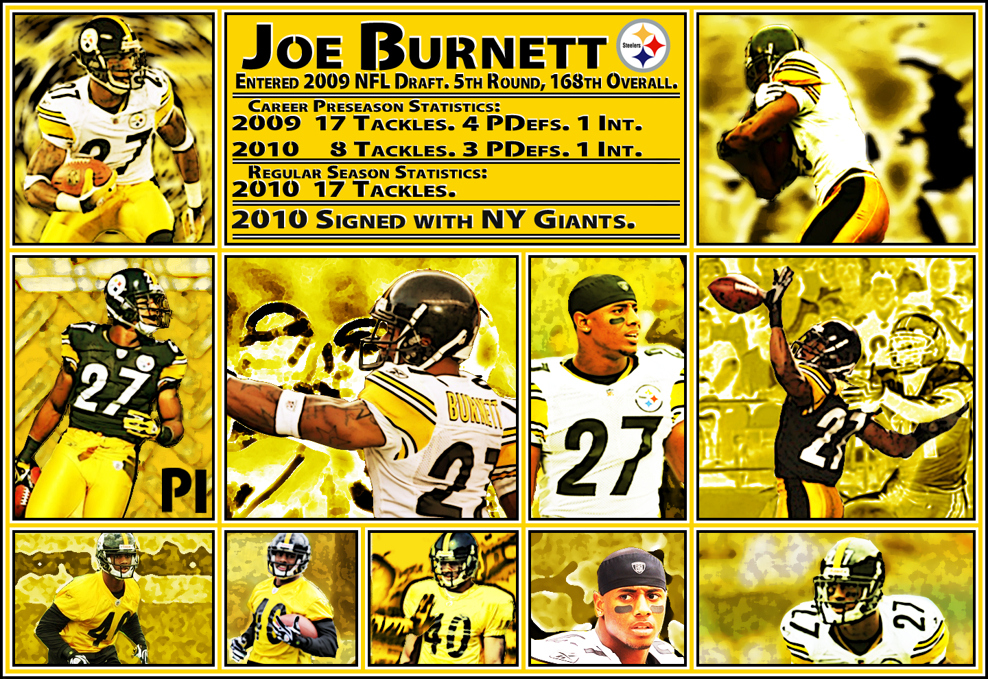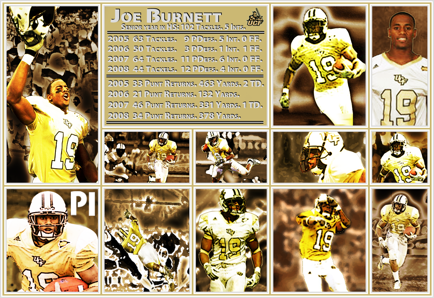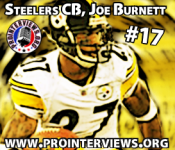 Joe Burnett played college football for the University of Central Florida. He played cornerback but also took over duties returning punts starting as a freshman and continuing throughout his senior season. He entered the 2009 NFL Draft, and was selected in the 5th round by the Pittsburgh Steelers. He played in the preseason with the Steelers and showed promise as a rookie. This interview was conducted before the 2010 NFL season.