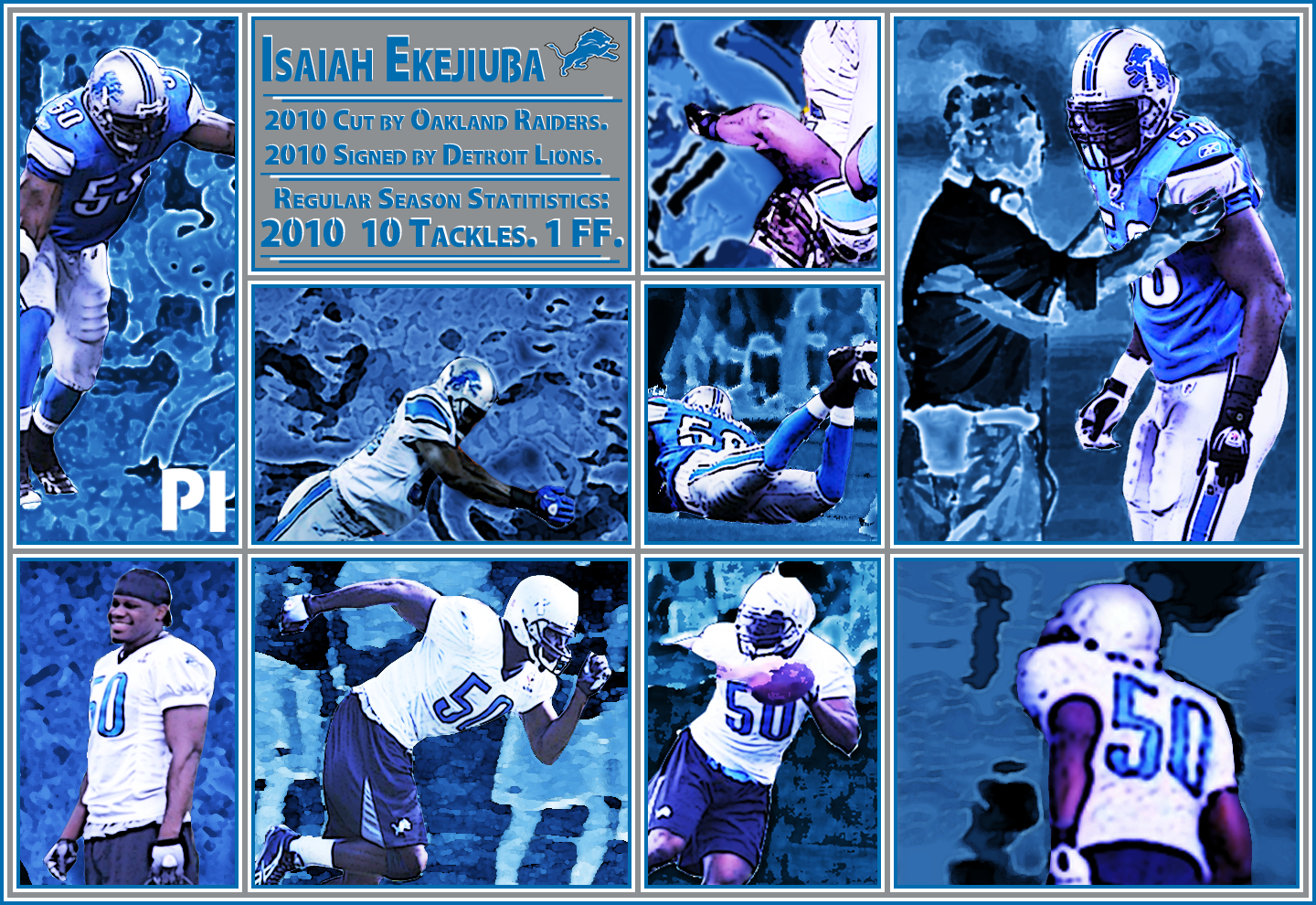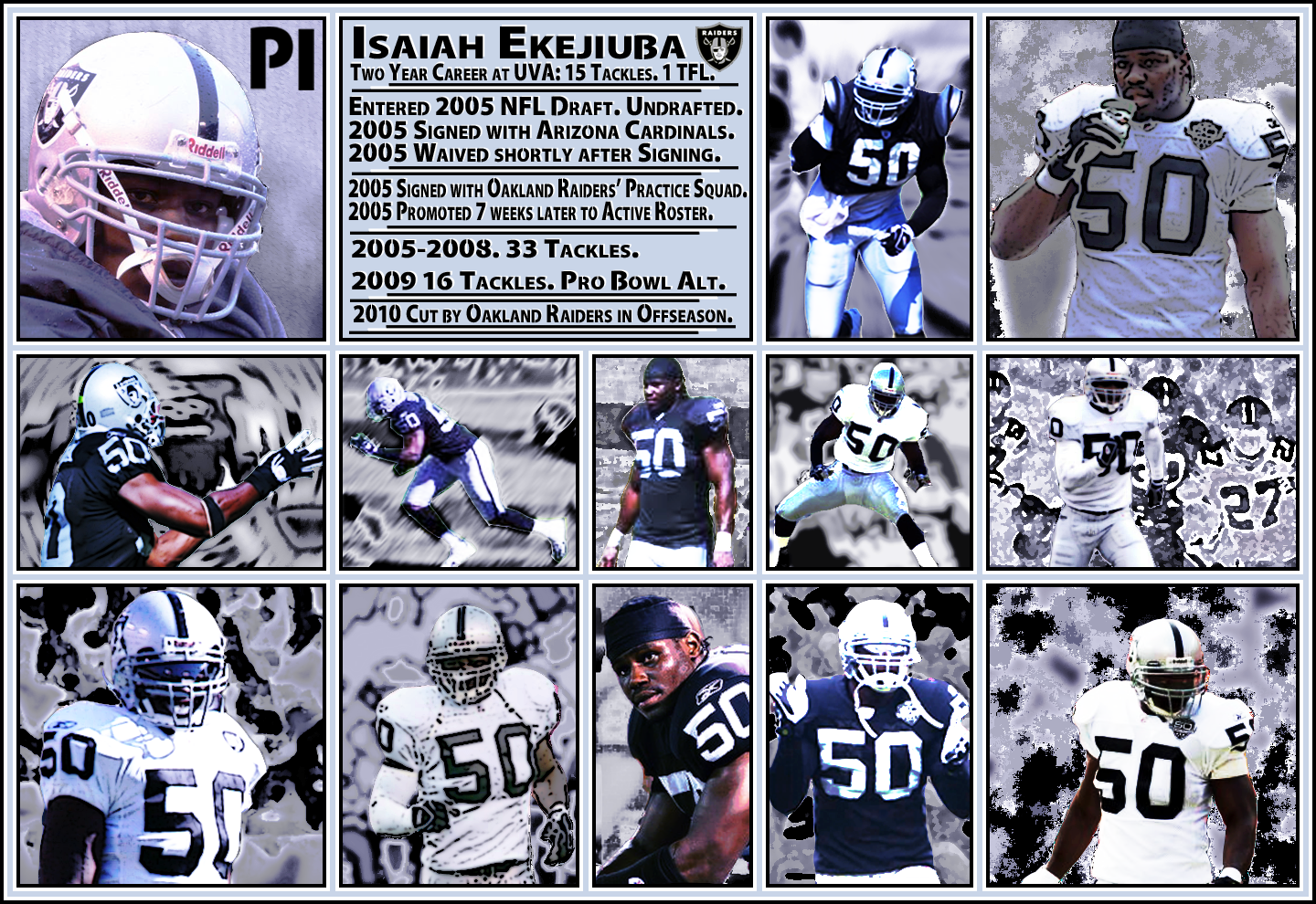 Isaiah Ekejiuba never played high school football, and only tried college football for the University of Virginia when he was first approached to try out for the team during his sophomore year. He had an immediate impact for the Cavaliers on Special Teams. He entered the 2005 NFL Draft, and signed as a UDFA with the Cardinals, but was cut. He then signed with the Oakland Raiders, and after a few weeks on the practice squad, he was promoted to the active roster. He played on Special Teams and in 2009, he was nominated to become a Pro Bowl alternate. [UPDATE: He was cut by the Raiders in the 2010 NFL offseason. He signed with the Detroit Lions.]