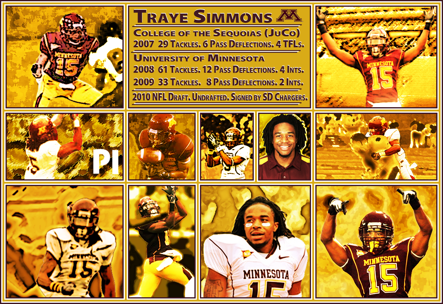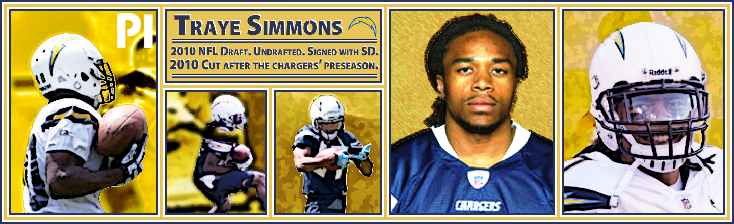 Traye Simmons first played junior college at the College of the Sequoias. He then transferred to play for the University of Minnesota. He entered the 2010 NFL Draft, but actually went undrafted. He signed a undrafted free agent contract with the San Diego Chargers. He didn’t end up making the final roster and was cut right after the Chargers’ preseason. [UPDATE: He has been out of the NFL since he was cut by the San Diego Chargers.]