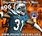 Announcement : My name is Max Strauss with http://prointerviews.org/, http://facebook.com/ProInterviews/ and http://twitter.com/ProInterviews/. I’d like to welcome you to the interview with Nate Ness. Ness started playing Junior College football at El Camino college, but then transferred to the University of Arizona to play his last two years. He entered the 2009 NFL Draft, but went undrafted. Ness has been a defensive back for the Browns, Jets, Seahawks and Dolphins. Ness has been on a few practice squads. He is currently playing for the Miami Dolphins. Here is the interview with Nate Ness.