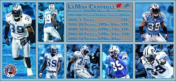 LaMar Campbell played college football at Wisconsin. He was undrafted after the 1998 NFL Draft. He played with the Lions for five years and while he was there he totaled 120 tackles, 4 forced fumbles. His lone interception in his career was thrown to him by Brett Favre and he returned it for a touchdown! Check out our interview. He started a radio show called “Life After The Game”, make sure you check it out.