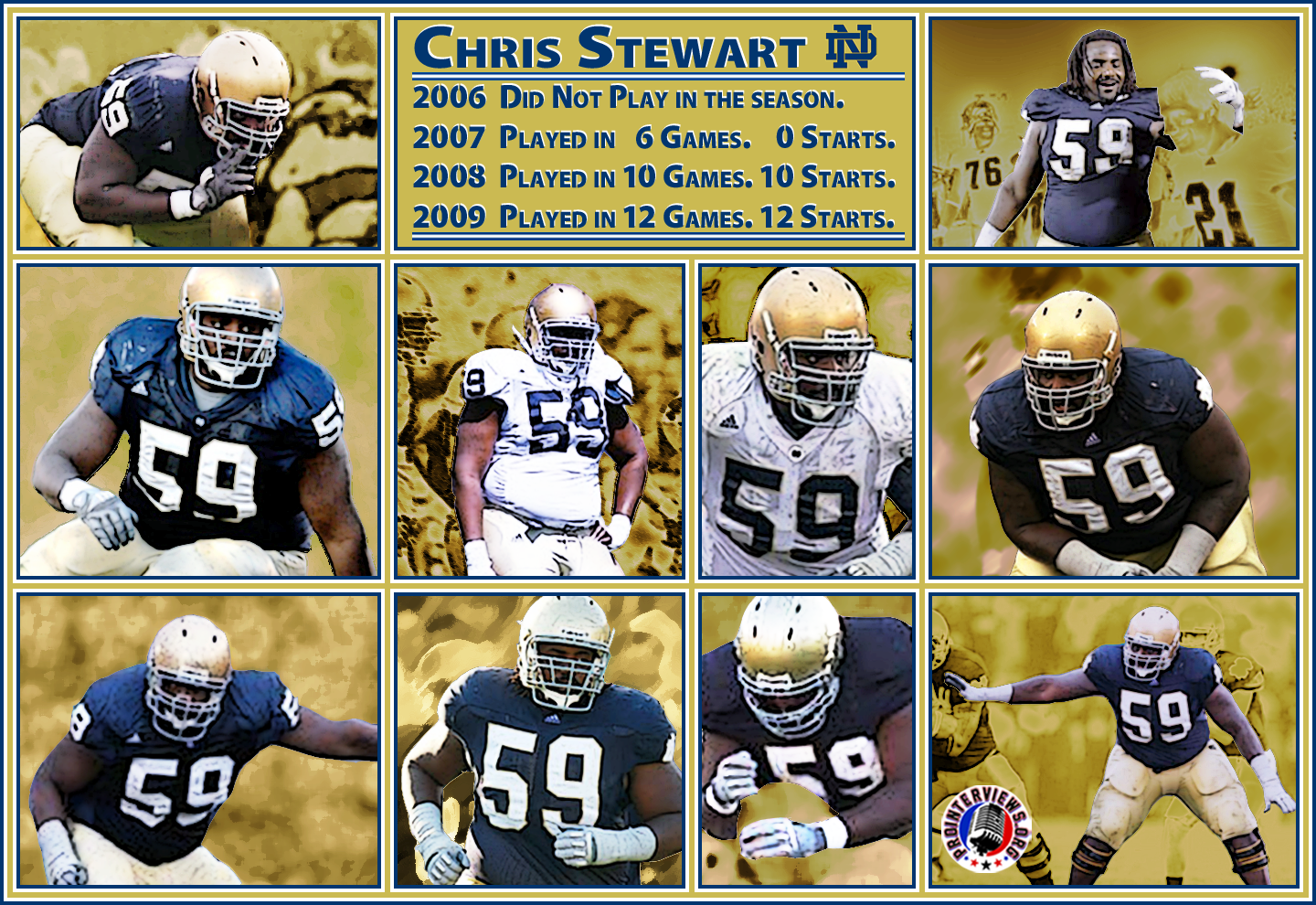 Chris Stewart was a member of Notre Dame Fighting Irish from 2007 through 2010. He entered the 2011 NFL Draft, but went undrafted through the seven rounds. He then signed a small contract with the New York Jets, but was cut before the final roster cuts. He never made the 53 man roster. He is currently on the Arizona Cardinals roster and fighting for a spot in the 53-man final roster. Click here to read the interview that we did in the middle of 2011 NFL season.