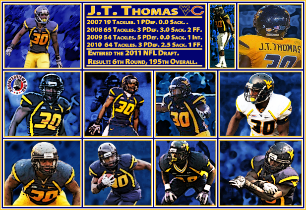 J.T. Thomas played college football at West Virginia. He played linebacker and while he was there he totaled 202 tackles, 12 pass deflections, 5.5 sacks, 3 forced fumbles, and 1 interception. He entered the 2011 NFL Draft, and was drafted in the 6th round by the Chicago Bears. He was placed on IR before the season started due to a back injury. He is planning on make a strong return to the NFL next year. This interview was conducted after the 2011 NFL season.