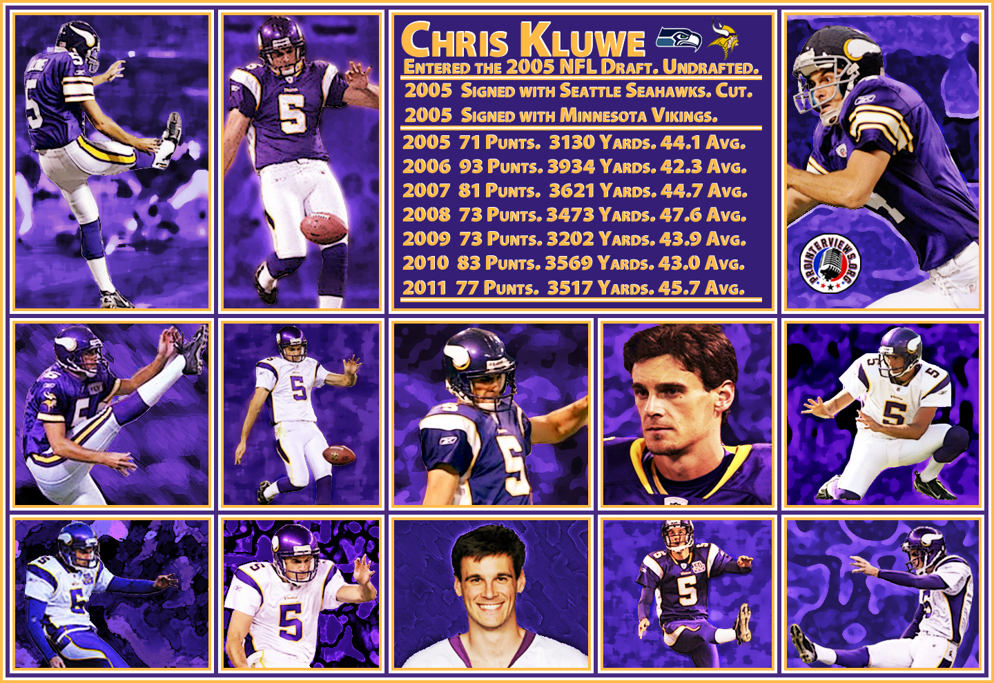 Chris Kluwe played college football at UCLA. He totaled 154 punts, 6,624 punt yards, with an average of 43 yards per punt. He entered the 2005 NFL Draft, but went undrafted. He signed with the Seattle Seahawks and was cut before the regular season. The Minnesota Vikings claimed him and he ended up as the starting punter and has remained as the starter since 2005. He is not afraid to speak about his love for video games, or his band, ‘Tripping Icarus’.