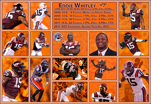 Eddie Whitley played college football at Virginia Tech University. During his time (2008-2011) at VT, he played in 54 games, and started 28 total. He started his career playing Special Teams, and then moved into the starting free safety role. He totaled 189 tackles, six tackles for loss, four interceptions, twelve pass deflections, and forced three fumbles. He has declared entry for the 2012 NFL Draft, and is projected to either be a seventh round or undrafted free agent. He could become a key Special Teamer. [UPDATE: EW earned a spot in the Dallas Cowboys’ 90-man roster.]